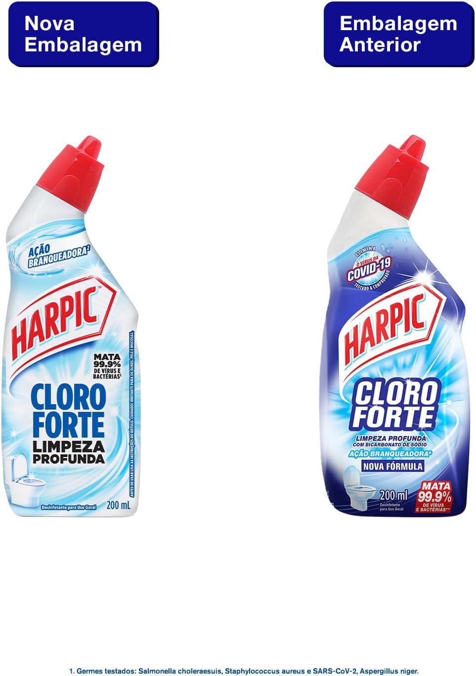 - Harpic cloro com fórmula poderosa que combina cloro + detergente + bicarbonato