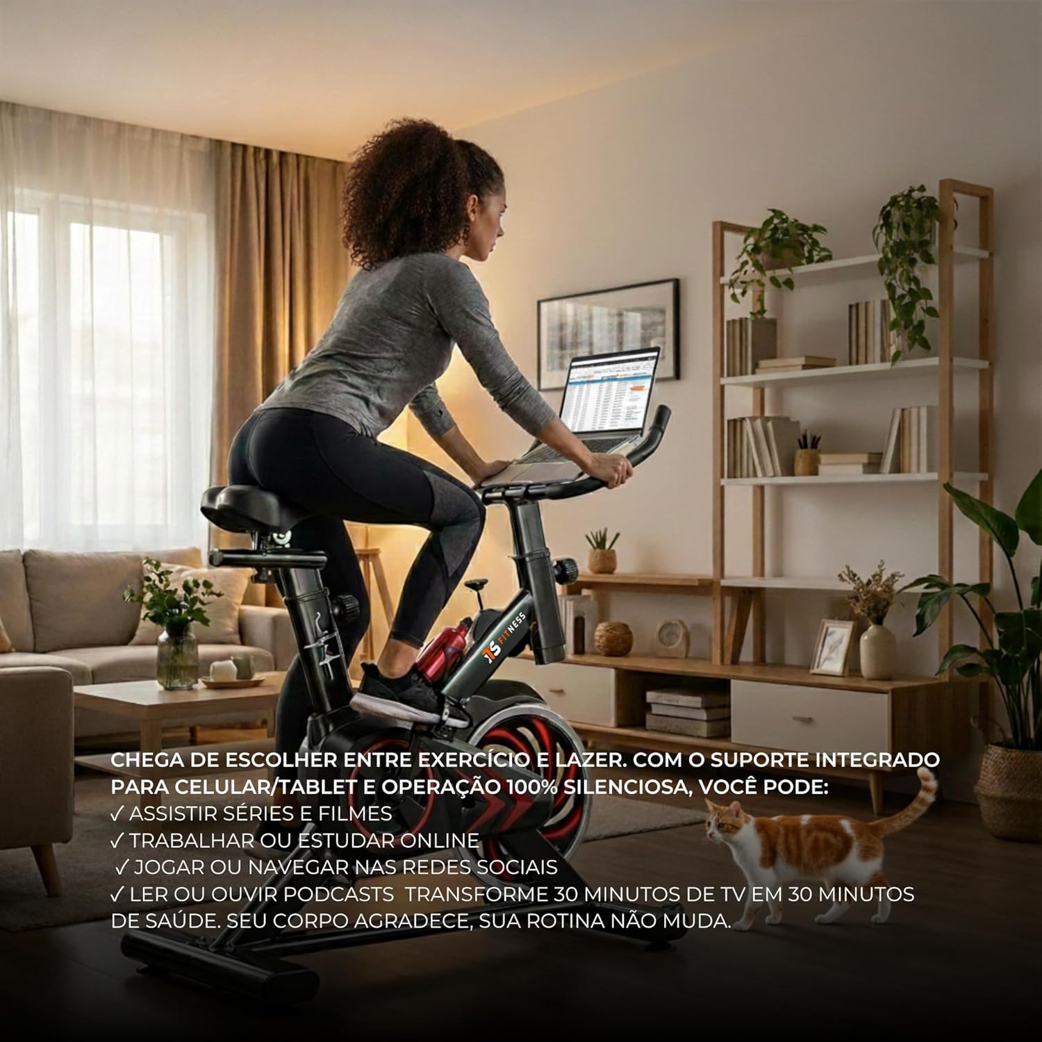 - Correia silenciosa: o sistema de transmissão por correia elimina ruídos durante o treino, permitindo usar a bike em apartamentos, quartos ou qualquer ambiente sem incomodar quem está ao redor.