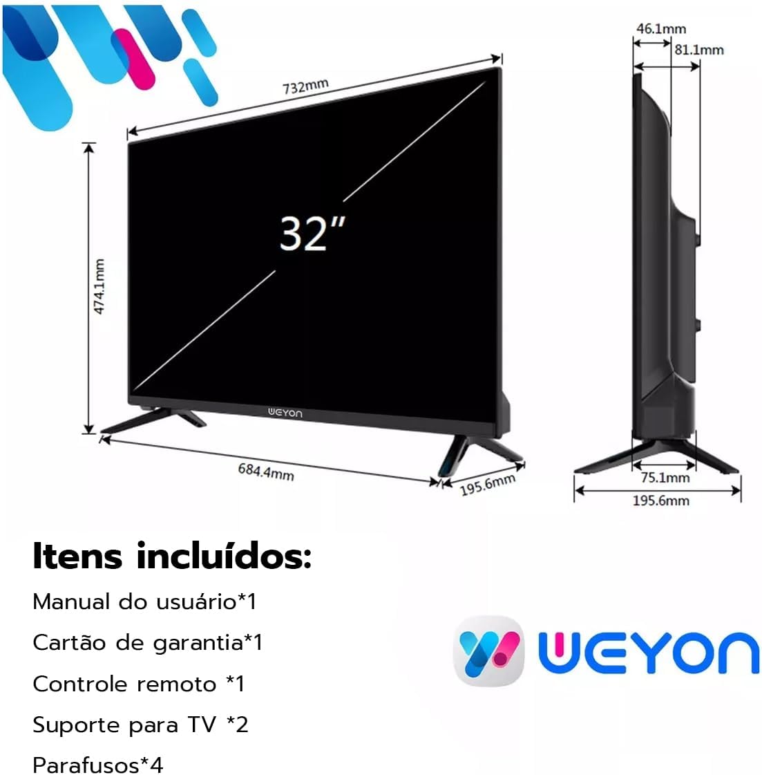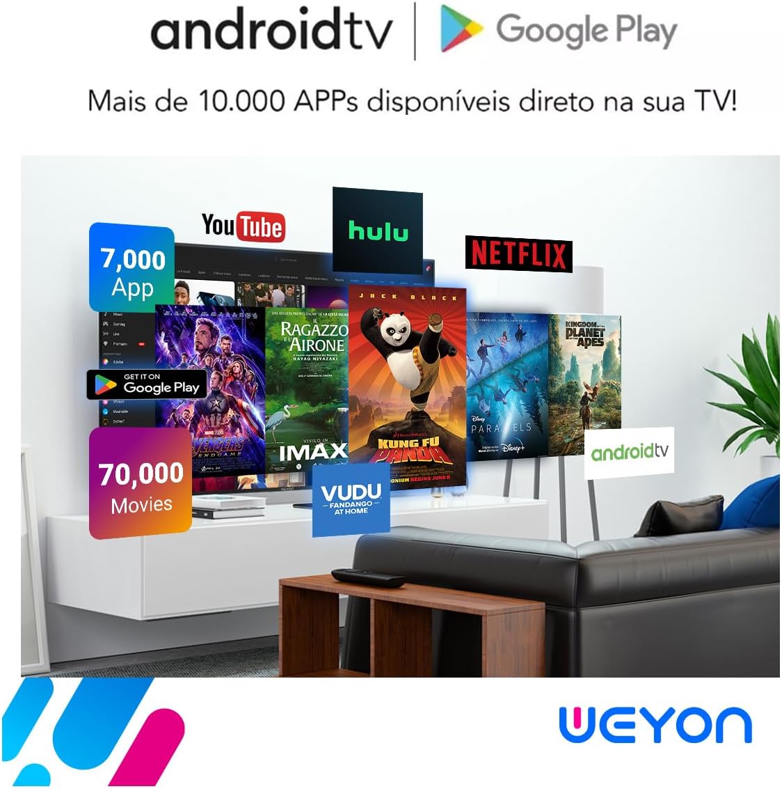 - Smart TV WEYON com Android 14: Desfrute de centenas de aplicativos com o melhor desempenho, acessando seu entretenimento de forma rápida, fácil e inteligente.
